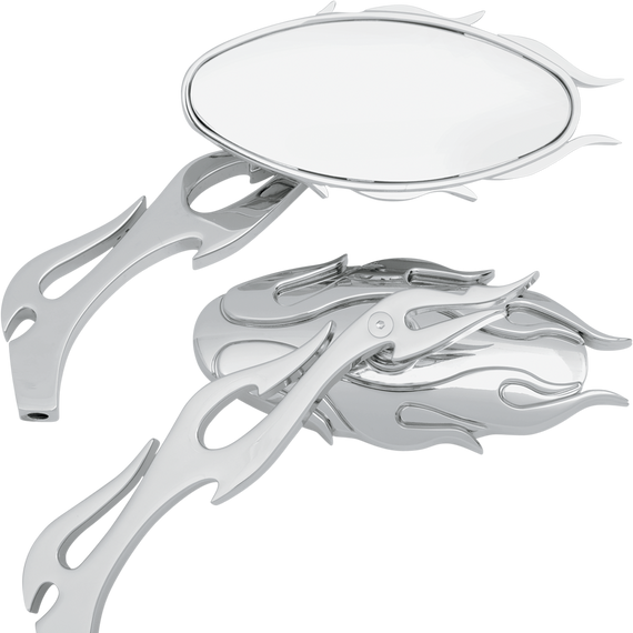 Caracteristicas: Die-cast mirrors with 6" chrome flame stems Mirror heads measure 4-3/4" x 2" Includes chrome mounting hardware