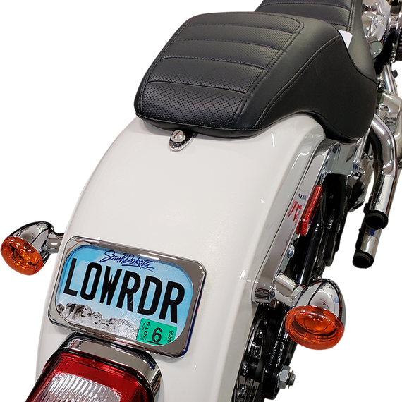 Caracteristicas: Radius license plate mounts offer a unique custom look Available for fenders 8" and wider Three-bolt style fits most OEM fenders that have three-hole bolt pattern (not for bobbed fenders) All mounts include frame, backing plate and hardware Accept most 4" x 7" license plates Made in the U.S.A. Check tire-to-fender clearance before operating.