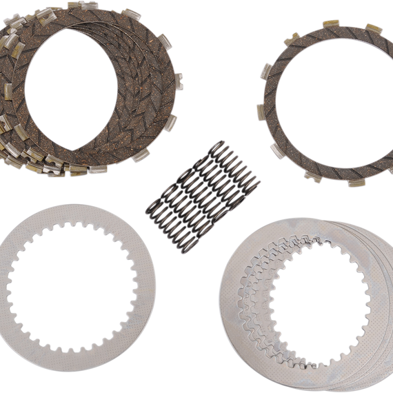Caracteristicas: Anti-swell, alloy-impregnated heavy-duty cork-based facings for smooth clutch take-up Allow modulation, unlike paper clutches that tend to snatch Complete engine set of friction plates, HD springs and steel separator plates prevent premature driven plate wear, oil muddying and loss of stack height Built with swagged aluminum carriers that spread the load on the clutch basket and prevent clutch basket "dogging" 10-15% uprated heavy duty clutch springs Not for use with 100% synthetic oil