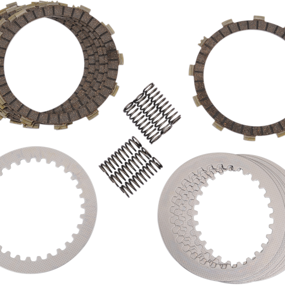 Caracteristicas: Anti-swell, alloy-impregnated heavy-duty cork-based facings for smooth clutch take-up Allow modulation, unlike paper clutches that tend to snatch Complete engine set of friction plates, HD springs and steel separator plates prevent premature driven plate wear, oil muddying and loss of stack height Built with swagged aluminum carriers that spread the load on the clutch basket and prevent clutch basket "dogging" 10-15% uprated heavy duty clutch springs