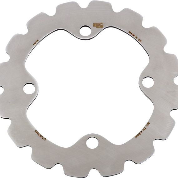 Caracteristicas: Heat-treated carbon steel brake rotors Steel construction extends rotor and brake pad life by eliminating galling Rotors come with or without scraper holes (according to OEM rotor design) A new range of brake rotors for ATV/Quad/Side x Side machines featuring lightweight vee-profiled contours These rotors look great and are self cleaning whilst improving brake performance Made from durable and tough heat treated stainless steel, 100% made in our British manufacturing facility using premium German mill-rolled steel, heat treated and then diamond ground to deliver great braking at less than OEM prices