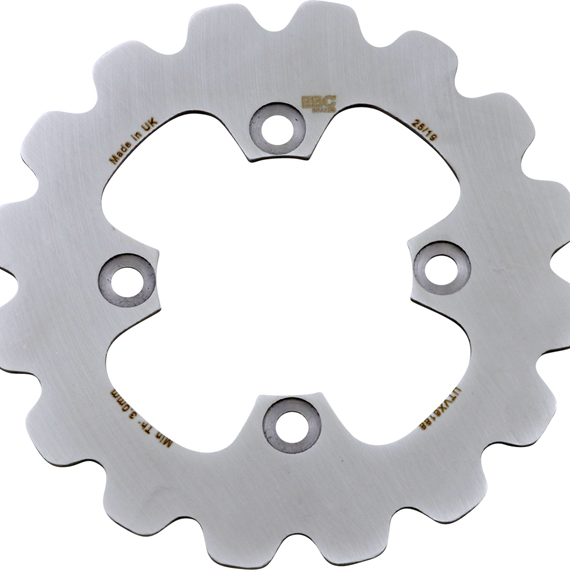 Caracteristicas: Heat-treated carbon steel brake rotors Steel construction extends rotor and brake pad life by eliminating galling Rotors come with or without scraper holes (according to OEM rotor design) A new range of brake rotors for ATV/Quad/Side x Side machines featuring lightweight vee-profiled contours These rotors look great and are self cleaning whilst improving brake performance Made from durable and tough heat treated stainless steel, 100% made in our British manufacturing facility using premium German mill-rolled steel, heat treated and then diamond ground to deliver great braking at less than OEM prices