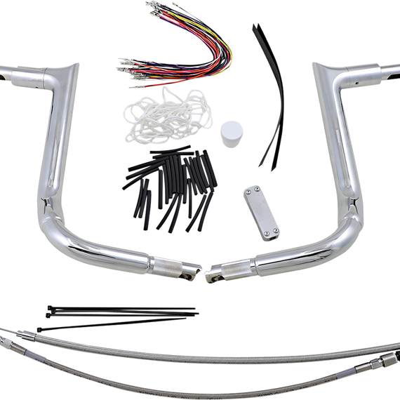Caracteristicas: Adjustable 1-½” collar next to handlebar controls for custom look Revolutionary bolt-together two-piece handlebar design that takes up half the shelf space, is easy to ship and even faster to install CNC mandrel-bent from 1-1/2" diameter x .095" wall heavy tube EZ install means no more need to fight internal wiring; install handlebar wiring in minutes Billet machined top with a large internal machined radius allows for EZ pulling of wiring (non-welded top corner) Install kits include everything needed to install the handlebars in half the time of other kits due to our design that only extends the existing clutch cable/ clutch line and brake lines Handlebars are knurled and notched for TBW applications Made in the U.S.A. Accepts OEM heated grips Patent No. 10,946,926