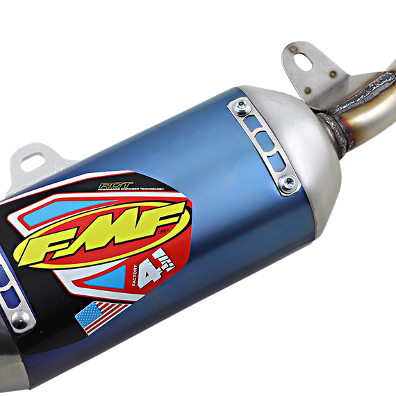 Caracteristicas: Factory 4.1 muffler available in natural titanium or blue anodized titanium with titanium end caps The lightest mufflers available Superior power and performance - horsepower improved throughout the rpm range Feature exclusive proprietary Chamber Core technology Factory Forward Engineering centralizes mass, improves handling Made from premium quality American materials Customize with performance tuning inserts and spark arrestor module Meet AMA sound requirements on most models; inserts available for others