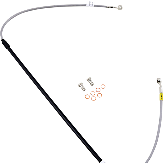 Caracteristicas: 64 braided strands of steel around the line, making the line have zero expansion at any time - better than any other braided line Requires less pressure at the lever, allowing the rider to use less force while stopping the bike faster and with better feel Fittings come from the factory pre-positioned but can swivel 180° if necessary to make the installation process easier Include a clear outer coating which protects the bike from scratches and the lines from humidity Complete with all necessary banjo bolts and washers Ready to install