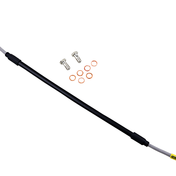 Caracteristicas: 64 braided strands of steel around the line, making the line have zero expansion at any time - better than any other braided line Requires less pressure at the lever, allowing the rider to use less force while stopping the bike faster and with better feel Fittings come from the factory pre-positioned but can swivel 180° if necessary to make the installation process easier Include a clear outer coating which protects the bike from scratches and the lines from humidity Complete with all necessary banjo bolts and washers Ready to install