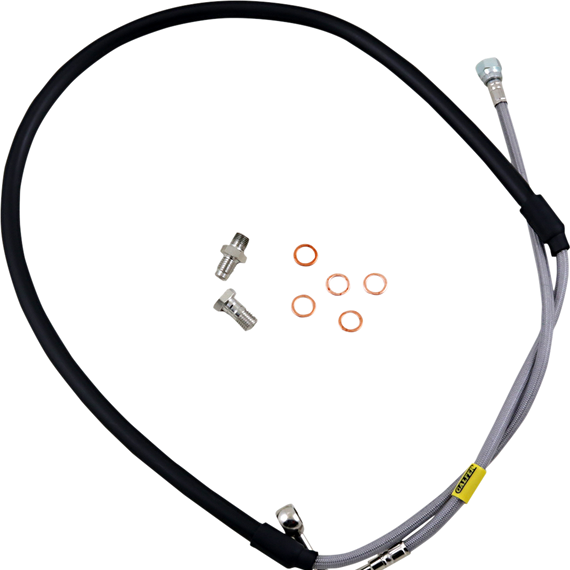 Caracteristicas: 64 braided strands of steel around the line, making the line have zero expansion at any time - better than any other braided line Requires less pressure at the lever, allowing the rider to use less force while stopping the bike faster and with better feel Fittings come from the factory pre-positioned but can swivel 180° if necessary to make the installation process easier Include a clear outer coating which protects the bike from scratches and the lines from humidity Complete with all necessary banjo bolts and washers Ready to install