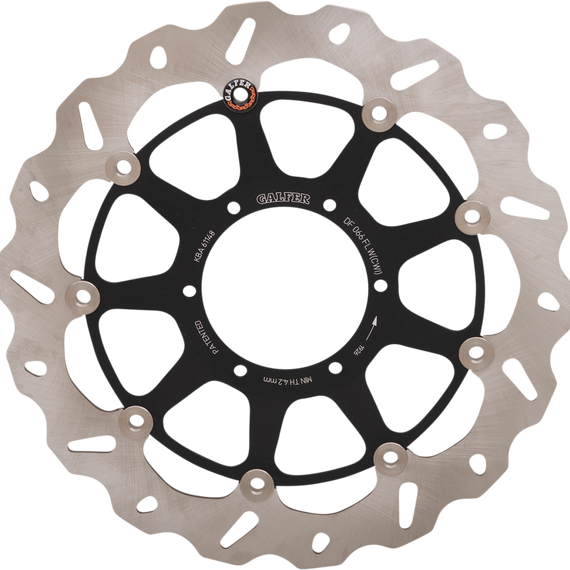 Caracteristicas: Laser-cut double disc ground 420 high carbon stainless steel Direct-replacement brake rotors; do not require any extra parts, bolt on just like a stock brake disc Full-floating design rotors have an aluminum center carrier Improves brake lever feel and modulation Rotors cool as they rotate to lower brake operating temperatures Design is self-cleaning, removes water as it rotates Less tendency to warp Manufactured in Spain For maximum braking performance and rotor longevity, Galfer recommends using Galfer brake pads with Galfer rotors.