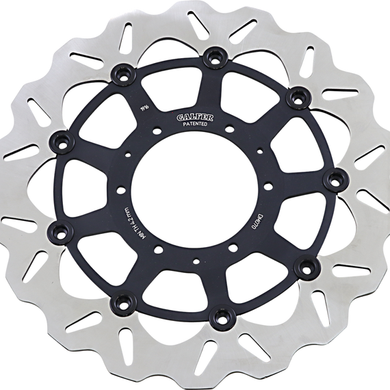 Caracteristicas: Laser-cut double disc ground 420 high carbon stainless steel Direct-replacement brake rotors; do not require any extra parts, bolt on just like a stock brake disc Full-floating design rotors have an aluminum center carrier Improves brake lever feel and modulation Rotors cool as they rotate to lower brake operating temperatures Design is self-cleaning, removes water as it rotates Less tendency to warp Manufactured in Spain For maximum braking performance and rotor longevity, Galfer recommends using Galfer brake pads with Galfer rotors.