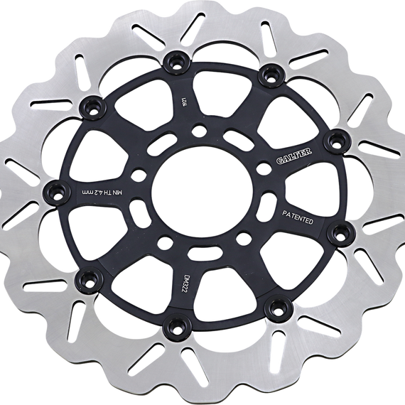 Caracteristicas: Laser-cut double disc ground 420 high carbon stainless steel Direct-replacement brake rotors; do not require any extra parts, bolt on just like a stock brake disc Full-floating design rotors have an aluminum center carrier Improves brake lever feel and modulation Rotors cool as they rotate to lower brake operating temperatures Design is self-cleaning, removes water as it rotates Less tendency to warp Manufactured in Spain For maximum braking performance and rotor longevity, Galfer recommends using Galfer brake pads with Galfer rotors.