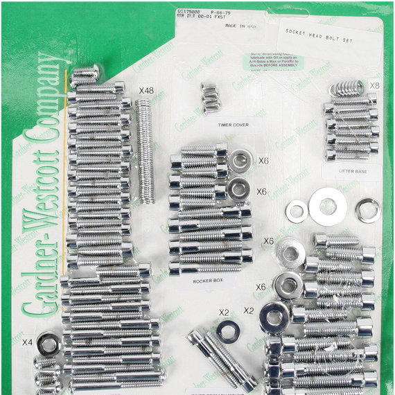 Caracteristicas: Kits feature polished stainless steel or polished chrome steel socket-head bolts Motor sets for Twin Cam include cam cover, primary cover, transmission side cover, oil hose cover, lifter base, rocker box, front inner primary, washer, motor and transmission mount bolts Motor set for M-Eight includes cam cover, primary cover, transmission covers, electric module cover, lifter base, rock boxes, top front motor mount and rear motor mount Side cover set include cam, primary, oil hose cover and transmission side cover Primary set include primary, inspection and derby cover Made in the U.S.A.