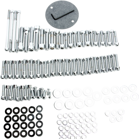 Caracteristicas: Kits feature polished stainless steel or polished chrome steel socket-head bolts Motor sets for Twin Cam include cam cover, primary cover, transmission side cover, oil hose cover, lifter base, rocker box, front inner primary, washer, motor and transmission mount bolts Motor set for M-Eight includes cam cover, primary cover, transmission covers, electric module cover, lifter base, rock boxes, top front motor mount and rear motor mount Side cover set include cam, primary, oil hose cover and transmission side cover Primary set include primary, inspection and derby cover Made in the U.S.A.