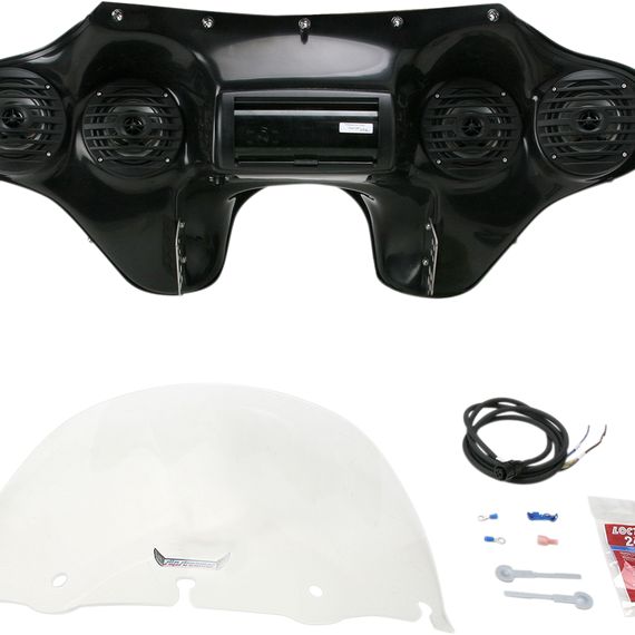 Caracteristicas: Classically styled fairing that delivers the ultimate in sound and wind protection Top-quality hand-laid fiberglass construction, gloss black gel-coated Include Jensen JHD3630BT head unit; features AM/FM/CD/USB SiriusXM capable and iPod Ready stereo with Bluetooth Stereo comes completely assembled with marine-grade weather door and four 5" pre-wired speakers Handlebar control is die cast aluminum and waterproof with rubberized buttons Concealed internal antenna for a clean, uncluttered look Easy quick-detach connection to bike's electrical system Kit includes quick-release brackets to mount on OEM windshield docking points or accessory detachable windshield docking points Includes a 12" clear windshield, will accept 96-13 FLHT OEM style and aftermarket replacement windshields (sold separately) (some drilling and trimming may be required) Made in the U.S.A. Fairings with handlebar control do not come with CD player.