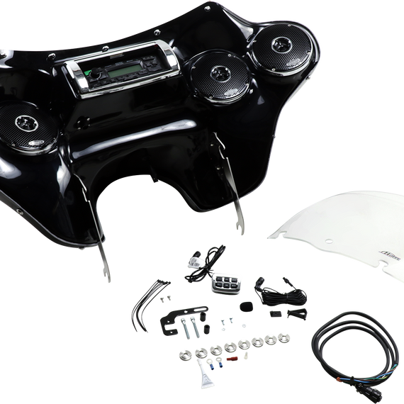 Caracteristicas: Classically styled fairing that delivers the ultimate in sound and wind protection Top-quality hand-laid fiberglass construction, gloss black gel-coated Include Jensen JHD3630BT head unit; features AM/FM/CD/USB SiriusXM capable and iPod Ready stereo with Bluetooth Stereo comes completely assembled with marine-grade weather door and four 5" pre-wired speakers Handlebar control is die cast aluminum and waterproof with rubberized buttons Concealed internal antenna for a clean, uncluttered look Easy quick-detach connection to bike's electrical system Kit includes quick-release brackets to mount on OEM windshield docking points or accessory detachable windshield docking points Includes a 12" clear windshield, will accept 96-13 FLHT OEM style and aftermarket replacement windshields (sold separately) (some drilling and trimming may be required) Made in the U.S.A. Fairings with handlebar control do not come with CD player.