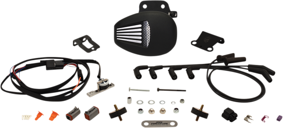 Caracteristicas: The new Milwaukee Eight Softail motorcycles utilize the center motor mount location to mount the coil. In order to install a JIMS Forceflow on these motorcycles, it was necessary to re-locate the coil. JIMS has developed a turnkey coil relocation system to move the coil to the front of the motorcycle inconspicuously tucked underneath the neck of the bike, in-between the frame tubes. This new mounting system allows the JIMS Forceflow to be installed on all Milwaukee Eight Softail motorcycles. This proven cooling system drops your cylinder head temperature by as much as 100 degrees. The cooling fan can be controlled manually or it can be regulated by a thermostat that monitors head temperature and activates the fan when engine temperature rises. This kit is highly recommended for performance motors to help extend engine life. This complete bolt in kit includes the high powered fan, housing with incorporated horn, thermostat, coil relocation kit with plug wires, all necessary hardware, wiring, and detailed instructions.