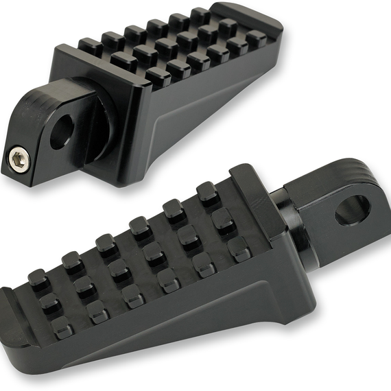 Caracteristicas: Footrests feature an intricately CNC-machined tread pattern in the top surface for optimal footing Much lighter than stock and have an angled design for better road clearance when cornering Machined from solid blocks of 6061-T6 billet aluminum Full 360° footpeg rotation makes these footpegs perfect for any application Male-mount footpegs have Joker's exclusive pitch adjustment screw to maintain the proper upward angle of the peg Dimensions 3-1/4" L x 1-1/4" W Made in the U.S.A.