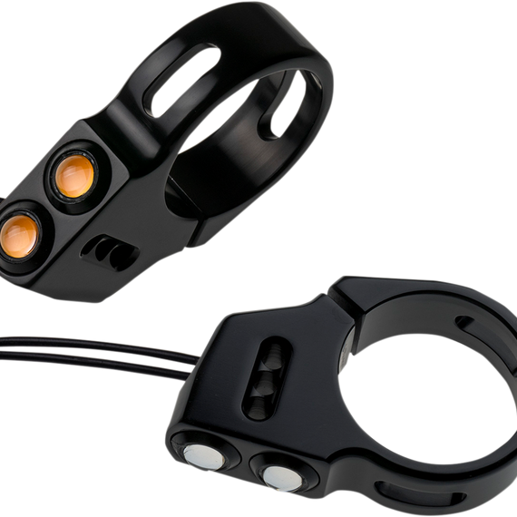 Caracteristicas: CNC-machined from billet aluminum Feature two DOT-compliant 18mm amber LED lights per side Exceptional beam angle Small compact design Single-function design Measure 1.690" W x .875" T Made in the U.S.A.