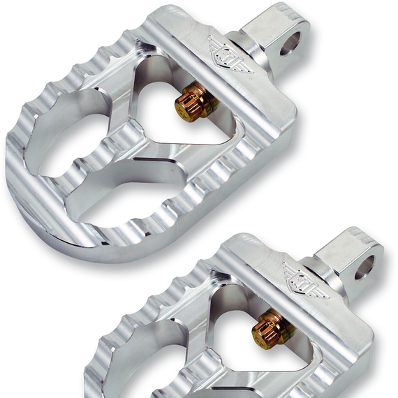 Caracteristicas: Fully CNC-machined from solid 6061-T6 bar Super strong, yet lightweight two-piece construction Wider foot surface for a comfortable ride Serrated surface provides a good bite to the bottom of your shoe Full 360° footpeg rotation makes these footpegs perfect for any application Pitch adjustment screw always keeps them in a good riding position Made in the U.S.A.