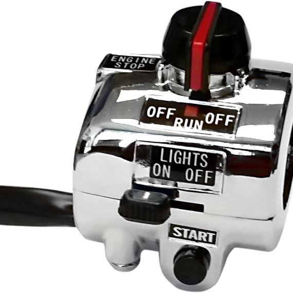 Caracteristicas: Aluminum alloy switch bodies Features engine stop/run, lights on/off and stop buttons Includes a 23” extension wire with matching connector For 7/8 handlebars DOT compliant
