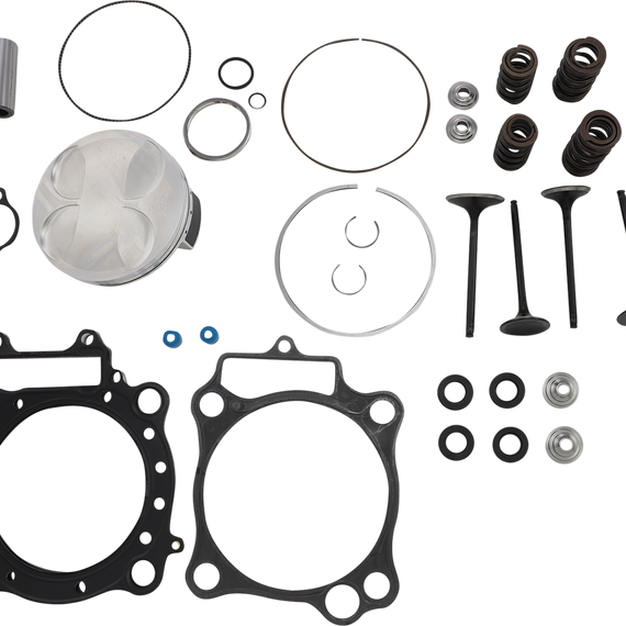 Caracteristicas: Kit includes the following 2 intake titanium retainers 2 exhaust titanium retainers 2 Intake CrSi valve springs 2 exhaust CrSi valve springs 2 intake H.T. steel basewashers 2 exhaust H.T. steel basewashers 2 intake Black Diamondƒ?½ valves 2 exhaust Black Diamondƒ?½ valves 1 high compression racing piston kit 1 top end gasket kit