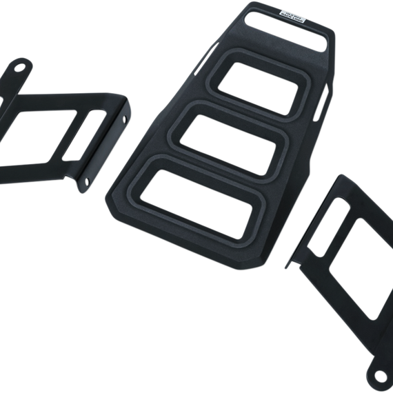 Caracteristicas: Includes fixed mounts that install discreetly between the fender and struts for a clean look Stylized cutouts on top and sides offer multiple secure points for bungee cords or luggage straps Durable stamped steel construction offered Includes all hardware and mounting brackets for easy bolt-on installation Styled to match the complete Kuryakyn Dillinger collection Recommended max load is 10 pounds