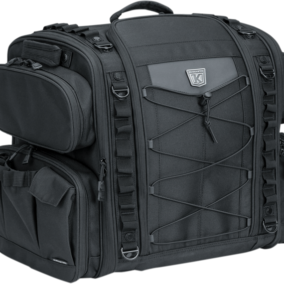 Caracteristicas: Made from UV-rated, weather-resistant 1200 denier textile material Durable structure maintains shape even when empty Wide center hatch opening with zippered side swing access doors for convenient cargo access Customized versatility with eight external stash pockets and two bottle pockets Padded media storage pocket for up to 15" laptops or tablets Internal zippered mesh pocket on the center hatch keeps smaller items organized External bungee storage system for coats, bedrolls or other items Quick-mount sissy bar strap design, plus full mounting strap kit for a variety of mounting options Multiple heavy-duty D-Rings for secure mounting options Integrated MOLLE modular attachment options Includes removable shoulder strap and low-profile carrying handles for easy transport off the bike Includes tethered rain cover for added protection from the elements