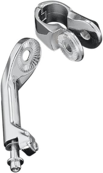 Caracteristicas: Now you can easily mount cruise pegs on Dresser/Touring models with highway bars and fairing lowers Special clamp interfaces with an offset arm to reach around the bike's lowers Entire assembly can be moved up or down on the engine guard or frame tubes Arm of the foot peg can be further adjusted along a vertical or horizontal arc Unique clevis permits angle adjustment of the foot peg Mount fits 1-1/4" diameter engine guards or frame tubing