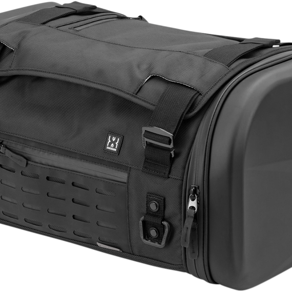 Caracteristicas: Convenient dual side access entry with wide opening for easy loading/unloading Built-in coat flap with adjustable G-Hook for quick and easy external storage Plush lined storage pocket on coat flap for cell phones, sunglasses or other items Laser-cut low-profile MOLLE modular attachment options Integrated heavy-duty welded D-Rings, sissy bar and mounting straps to mount to additional bags, luggage racks or passenger seats Thermoformed construction and components for strength, security and shape retention Reflective accents for enhanced visibility UV-rated and weather-resistant 1680 denier textile material, with included rain cover Glove-friendly, weather-resistant zippers Premium lined interior with multiple pockets and compartments Heavy-duty ergonomic carrying handle