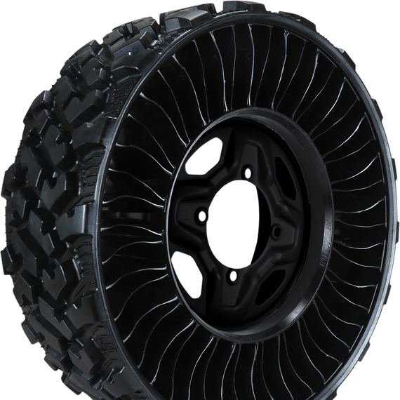 Caracteristicas: Zero-degree belts (under the tread) and proprietary design provide great lateral stiffness, while resisting damage and providing excellent cornering and side-hill stability High-strength, poly-resin spokes carry the load, absorb impacts and provide a unique energy transfer that reduces the "bounce" associated with pneumatic tires Michelin's proprietary Comp10 Cable™ forms a semi-rigid "shear beam", and allows the load to hang from the top No complex mounting equipment needed and once they are bolted on, there is no air pressure to maintain Designed specifically for difficult environments and conditions, rugged roads and jagged terrain Airless radial tire is one single unit with a heavy-gauge steel hub Not certified for use on public roads (NHS) Non-directional tread pattern Available in flat black