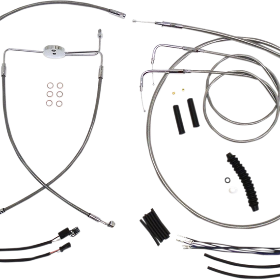Caracteristicas: Magnum XR Handlebar Installation Kits offer a great fit and excellent quality at an economical price Kit features highly polished, chrome plated fittings All cables are a low effort, high efficiency design that meets or exceeds all OE specifications for fitment, construction, endurance Magnum XR Brake Lines use an enhanced construction of heavy gauge stainless steel embedded in tough abrasion resistant nylon outer jacket for superior durability and extreme braking response for safe riding The coating on cables and brake lines offers exceptional protection for paint or chrome Kits that include manifolds use an all brazed construction to ensure optimal OE fitment and appearance Manifolds use -3 AN connections for an easy installation Kits include throttle and idle cables or throttle-by-wire extensions, clutch cable or XR hydraulic clutch line, XR brake lines, copper crush washers, hardware, turn signal and switch wiring extensions Kits are based on using ape hanger style handlebars and 2" risers.