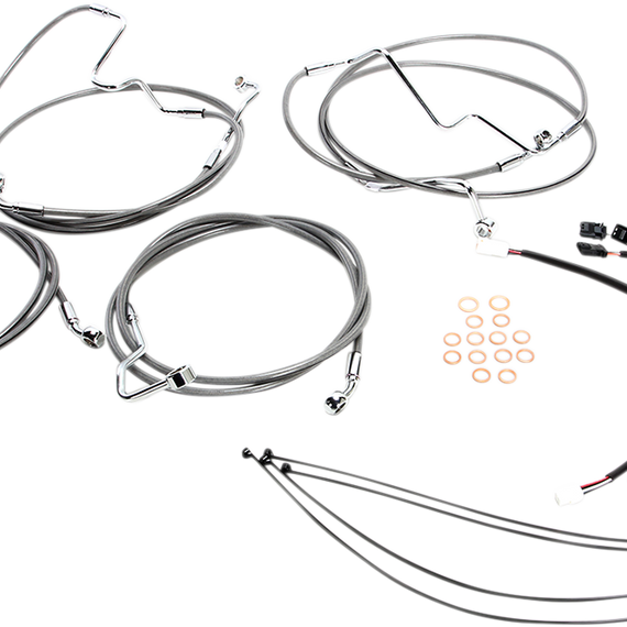 Caracteristicas: Magnum XR Handlebar Installation Kits offer a great fit and excellent quality at an economical price Kit features highly polished, chrome plated fittings All cables are a low effort, high efficiency design that meets or exceeds all OE specifications for fitment, construction, endurance Magnum XR Brake Lines use an enhanced construction of heavy gauge stainless steel embedded in tough abrasion resistant nylon outer jacket for superior durability and extreme braking response for safe riding The coating on cables and brake lines offers exceptional protection for paint or chrome Kits that include manifolds use an all brazed construction to ensure optimal OE fitment and appearance Manifolds use -3 AN connections for an easy installation Kits include throttle and idle cables or throttle-by-wire extensions, clutch cable or XR hydraulic clutch line, XR brake lines, copper crush washers, hardware, turn signal and switch wiring extensions Kits are based on using ape hanger style handlebars and 2" risers.