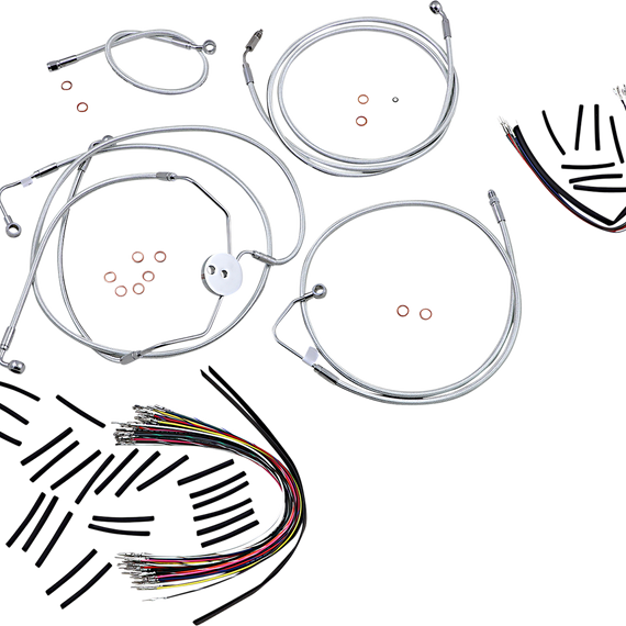Caracteristicas: Complete kits with matching braided cables and brake lines Kits include throttle and idle cables of throttle-by-wire extensions, clutch cable or hydraulic clutch line, brake lines, copper crush washers, hardware, and any necessary switch wiring of turn signal extension All cable and brake lines feature Sterling Chromite II braid with highly polished chrome plated fittings All cables are a low-effort, high-efficiency design that meets or exceeds all OE specifications for fitment, construction and endurance Kits for dual disc models include an all brazed manifold that eliminates leaks, alignment problems and unattractive threaded connections Assembled in the U.S.A. Kits are based on using ape hanger style handlebars with 2†risers