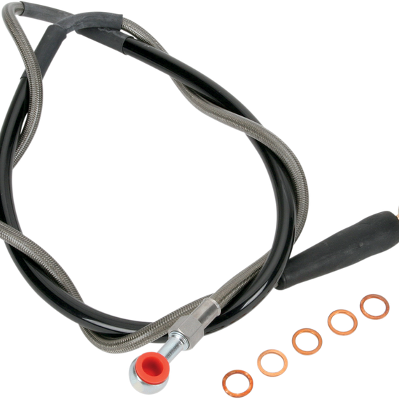 Caracteristicas: Swivel union ends are the secret to easier fitting, and ensure a kink- and stress-free installation Venhill Engineering in the UK makes Moose Racing Stainless Steel Brake and Clutch lines to the highest specifications Each line is made from top quality DuPont Teflon®-coated hose, wrapped with British-made stainless steel, and PVC-coated for protection and great looks Rubber protection boots and extra-rigid tubing are used to protect vulnerable areas from heat and impact and to prevent hose flex under compression Each line is designed to withstand a minimum of 14,000 psi Installing Moose Racing stainless lines gives a large performance increase by significantly reducing expansion under pressure and absorption of water when compared to stock rubber hoses