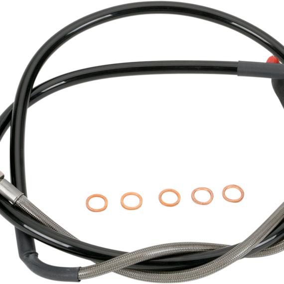 Caracteristicas: Swivel union ends are the secret to easier fitting, and ensure a kink- and stress-free installation Venhill Engineering in the UK makes Moose Racing Stainless Steel Brake and Clutch lines to the highest specifications Each line is made from top quality DuPont Teflon®-coated hose, wrapped with British-made stainless steel, and PVC-coated for protection and great looks Rubber protection boots and extra-rigid tubing are used to protect vulnerable areas from heat and impact and to prevent hose flex under compression Each line is designed to withstand a minimum of 14,000 psi Installing Moose Racing stainless lines gives a large performance increase by significantly reducing expansion under pressure and absorption of water when compared to stock rubber hoses