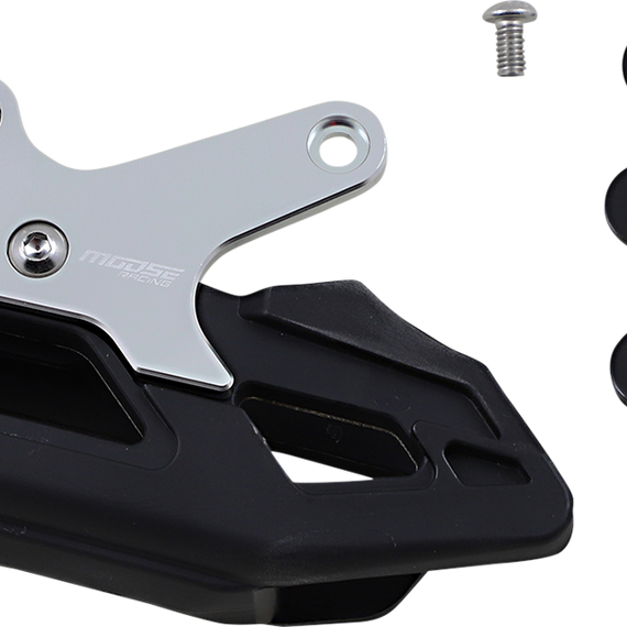 Caracteristicas: Main chain guide body is made from 6061 T6 Aluminum for added strength and durability Chain block is made from high density TPU materials for guaranteed high wear abrasion and impact resistance High quality anodization to prevent fade when exposed in high UV climates 3D Design helps prevent mud and debris from building up and causing chain derailment Mounting hardware is included