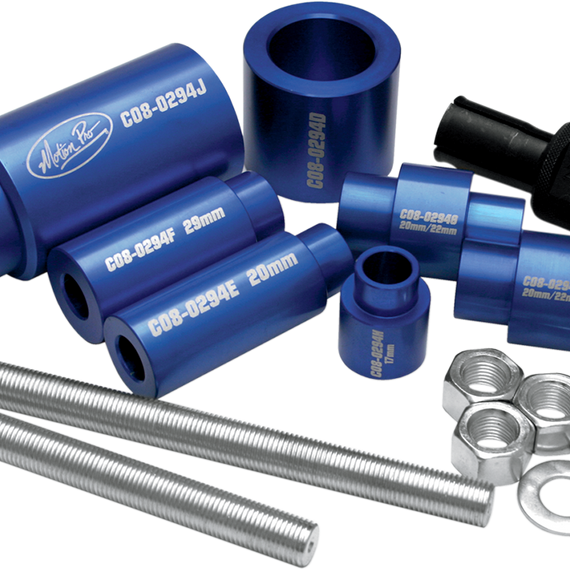 Caracteristicas: Kit includes Blind Bearing Puller Adapter, which can also be used as an accessory with the Motion Pro Blind Bearing Remover set and blind bearing collet for removal of 20 mm blind bearings (other sizes available) Designed for quick, easy removal and precise installation of suspension linkage and swingarm pivot bearings A must-have time-saving tool for professional technicians, serious racers and home mechanics For use on 20 mm and 22 mm inside diameter bearings Laser-etched markings for easy size identification Protective blow-molded case for easy storage Fits most off-road motorcycles and ATVs Eliminates the need for a shop press