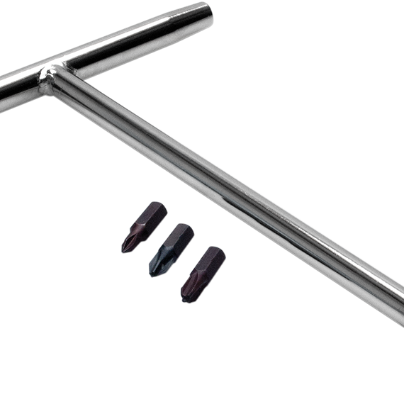 Caracteristicas: High quality Motion Pro® standard bit driver T-handle Includes Japanese Industrial Standard (JIS) cross-head bits #1, #2, and #3; also accepts all common driver bits Features 3 drive heads, one at end of shaft and 2 at each end of handle with magnets to hold drivers firmly in place Narrow drive head profile fits into tight spaces