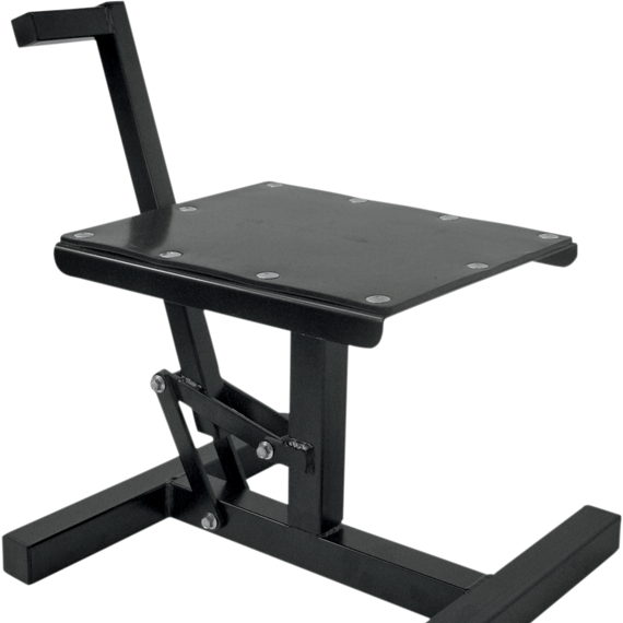 Caracteristicas: Lifts both wheels of bike off the ground when in raised position Lowers easily by lifting foot pedal with foot Finished with rubber end caps installed on all box tubing ends 14" x 15" H-shaped base for maximum stability Lowest height is 11-1/4" Weighs only 14 lb.