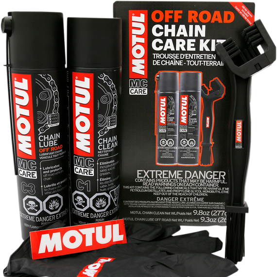 Caracteristicas: A complete kit for drive chain cleaning and lubrication, for either road or offroad applications I addition to the appropriate lubricant, each kit includes 9.8 oz can of Chain Clean (PART #3704-0169), chain brush, black nitrite gloves and Motul sticker