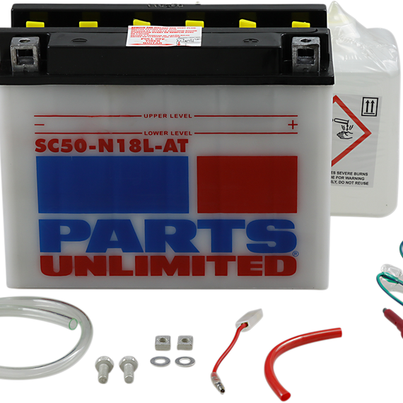Caracteristicas: Powerful starting power at a great price! Parts Unlimited Heavy-Duty batteries are built to the same exacting specifications and quality-control standards as OEM Rugged and provide more cranking power over standard batteries Lead calcium alloy reduces water loss and service by 66% compared to standard batteries Includes anti-sulfation chemical formulated to reduce sulfate crystal buildup on the battery plates Reduces self-discharge for longer time between charges Fiberglass separators improve acid flow Kit includes battery, pre-measured acid pack, red filler tube, hardware kit and clear vent tube