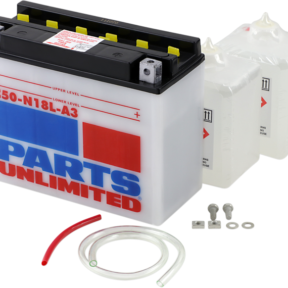 Caracteristicas: Powerful starting power at a great price! Parts Unlimited Heavy-Duty batteries are built to the same exacting specifications and quality-control standards as OEM Rugged and provide more cranking power over standard batteries Lead calcium alloy reduces water loss and service by 66% compared to standard batteries Includes anti-sulfation chemical formulated to reduce sulfate crystal buildup on the battery plates Reduces self-discharge for longer time between charges Fiberglass separators improve acid flow Kit includes battery, pre-measured acid pack, red filler tube, hardware kit and clear vent tube