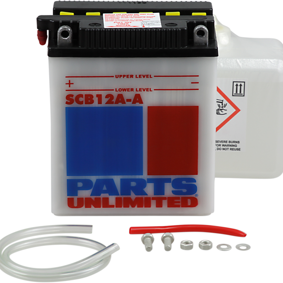 Caracteristicas: Powerful starting power at a great price! Parts Unlimited Heavy-Duty batteries are built to the same exacting specifications and quality-control standards as OEM Rugged and provide more cranking power over standard batteries Lead calcium alloy reduces water loss and service by 66% compared to standard batteries Includes anti-sulfation chemical formulated to reduce sulfate crystal buildup on the battery plates Reduces self-discharge for longer time between charges Fiberglass separators improve acid flow Kit includes battery, pre-measured acid pack, red filler tube, hardware kit and clear vent tube
