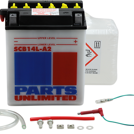 Caracteristicas: Powerful starting power at a great price! Parts Unlimited Heavy-Duty batteries are built to the same exacting specifications and quality-control standards as OEM Rugged and provide more cranking power over standard batteries Lead calcium alloy reduces water loss and service by 66% compared to standard batteries Includes anti-sulfation chemical formulated to reduce sulfate crystal buildup on the battery plates Reduces self-discharge for longer time between charges Fiberglass separators improve acid flow Kit includes battery, pre-measured acid pack, red filler tube, hardware kit and clear vent tube