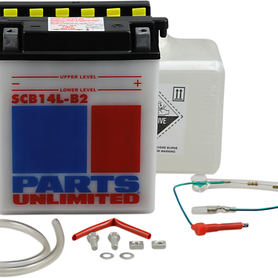 • Kit includes battery, pre-measured acid pack, red filler tube, hardware kit and clear vent tube