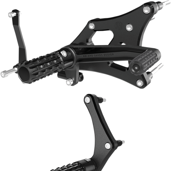 Caracteristicas: Move foot position approximately 1" up, 1" back and 1.5" narrower per side for increased ground clearance when cornering Utilize OEM rear master cylinder and shift lever Designed to fit seamlessly with RSD slant 2-into-1 exhaust system Eliminates bulky, heavy OEM cast steel foot peg brackets, bell crank brake rod and master cylinder bracket Made in the U.S.A.