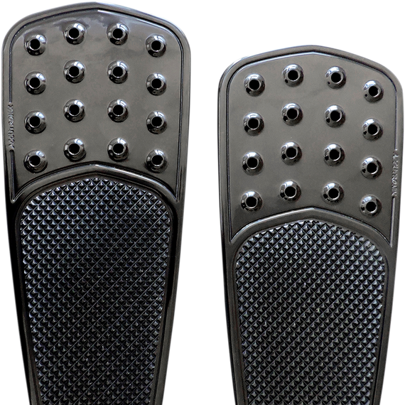 Caracteristicas: Replace the stock OEM front floorboards for a more custom look Extended 63.5 mm (2-1/2") in the front, and 19 mm (3/4") wider and 25.4 mm (1") longer in the rear Mounts like stock with stock hardware Machined with 6061 T-6 billet aluminum The top portion of the board has a raised hole feature inspired by racing pedals The lower area is a multi-directional, slip-resistant Machined Pyramid-Top Knurled design