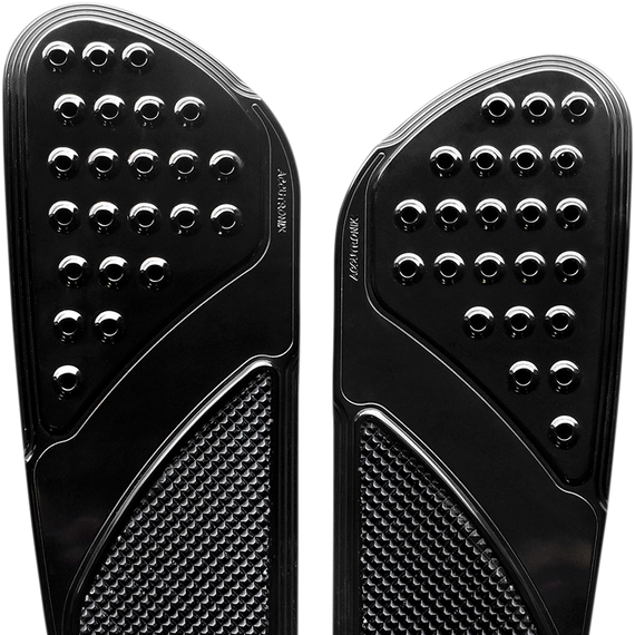 Caracteristicas: Replace the stock OEM front floorboards for a more custom look Extended 63.5 mm (2-1/2") in the front, and 19 mm (3/4") wider and 25.4 mm (1") longer in the rear Mounts like stock with stock hardware Machined with 6061 T-6 billet aluminum The top portion of the board has a raised hole feature inspired by racing pedals The lower area is a multi-directional, slip-resistant Machined Pyramid-Top Knurled design