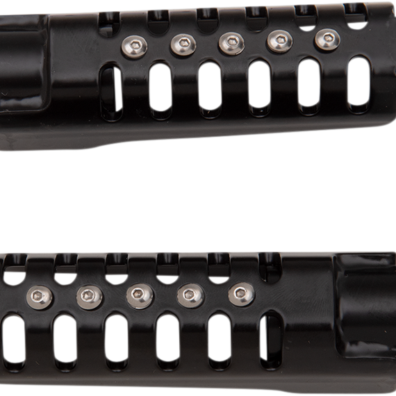 Caracteristicas: Powder-coated steel pegs offer good lean angle with their slash style bottom edge Traction screws line the top surface for added grip Screws can be installed with the provided split lock washers, or give them an even more aggressive bite by removing the lock washers and installing the screws with heavy-duty Loctite®? for more exposed screw through the top Fit most H-D clevis mounts