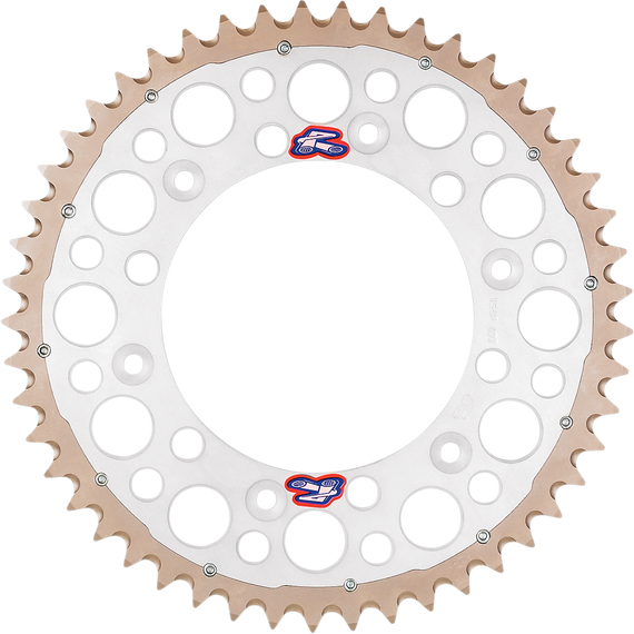 Caracteristicas: Inner ring is the same high strength Ultralight™ 7075 T-6 aluminum used for the standard Renthal sprocket Outer ring is electro-less nickel coated steel for ultimate durability and is designed with the minimum amount of material to keep weight down The outer ring is expanded at 200°C and then fitted over the inner; this interference fit combined with the wave pattern ensures a permanent bond for the life of the chainwheel The flat socket head screws add additional strength to the chainwheel during side impacts and eliminates contact with the chain guide Self cleaning mud grooves between each tooth prevent dirt build upand reduce chainwheel wear and weight Will outlast a standard all aluminum sprocket by 3 times, yet is much lighter than an all steel rear sprocket