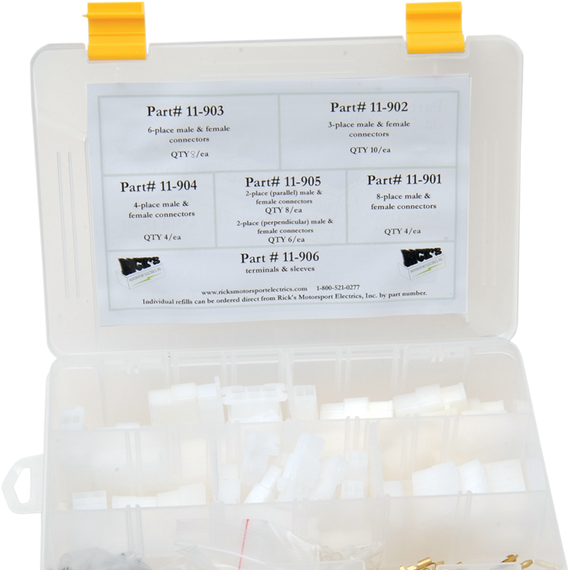 Caracteristicas: Wire connector/terminal kit contains an assortment of male and female connectors, matching terminals and wire sleeving often used on imported motorcycles Kit includes (8) 6-place male/female connectors, (4) 4-place male/female connectors, (8) 2-place (parallel) male/female connectors, (6) 2-place (perpendicular) male/female connectors, (4) 8-place male/female connectors, (10) 3-place male/female connectors, (25) plastic sleeves, (25) female stud connectors, (25) male stud connectors, (50) male spade connectors, (50) female spade connectors